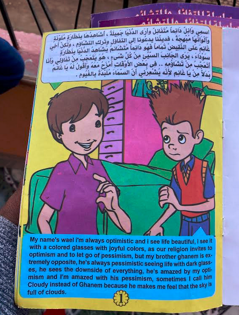 Nabil’s two girls, Bennu 10 and Sanura 8 who arrived about 20 minutes after we had, are learning English through Optimism and Pessimism Series – rudimentary proactive comics that depict brothers with completely different ways of looking at typical situations in everyday life. Bennu and Sanura proudly show me some from a pile of their books. They are dual lingual Arabic and English, with the latter grammar poor, but at least children can learn some greater vocabulary and spelling, as well as great Life Lessons on coping and critical thinking. Obviously, Optimism has greater outlooks and therefore he’s blessed with better things, while Pessimism seems to have the worst luck and the equally worst methods of handling situations.